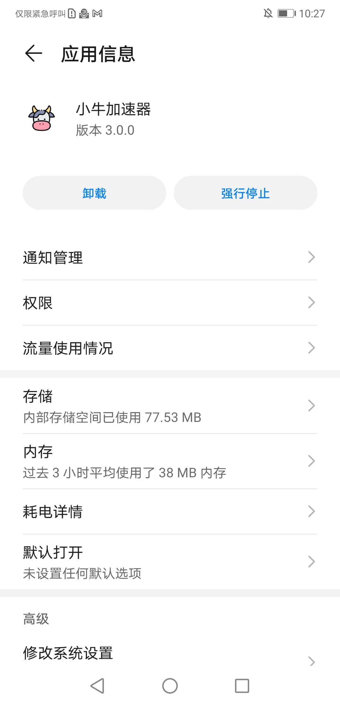 去到 设置 -> 应用 -> 应用管理 -> 小牛加速器,点 “强行停止”。或者 设置 -> 应用和服务 -> 应用管理 -> 小牛加速器,点 “强行停止”。
